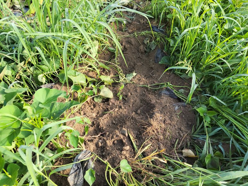 여기, 멧돼지들이 잔치를 벌였던 곳입니다. 빼꼼이 한고랑만 정리해 봅니다. 내친김에 조금 더? ㅎㅎ 요만큼 배추 모종 심고, 무는 씨로 뿌리려고요. 여전히 덥고 땀나고ᆢ 멧돼지들이 어지럽힌 밭 정리, 힘드네요.