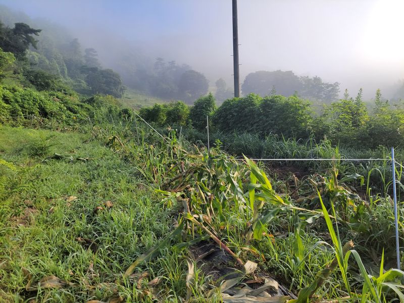 지금 보이는 곳이 얼마전 멧돼지들이 잔치를 벌였던 고구마 옥수수 밭입니다. 어제 군에서 나와봤고 오늘 예초기로 정리했습니다. 드문드문 살아남은 고구마 줄기들이 보이는데요. 얘들마져 먹으러 또 올라나요? 아무튼 귀농후 첫농사에 이런일이 생기니 의기소침해 집니다. 해...
