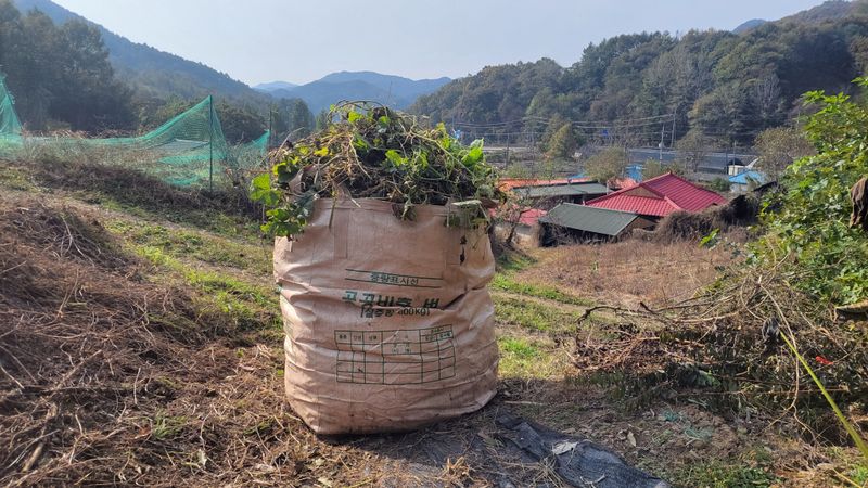 이곳 보은은 엇그제 부터 오늘까지 서리가 내렸습니다. 사진에 보이는 애호박이 올해보는 마지막 모습일겁니다. 오늘은 여름 내 농막을 점령했던 호박덩쿨을 걷어내는 작업, 톤백에 담아 새로 조성하는 밭으로 옮겨갈까 했는데요. ㅎㅎ 무게가 장난 아닙니다.