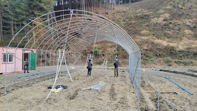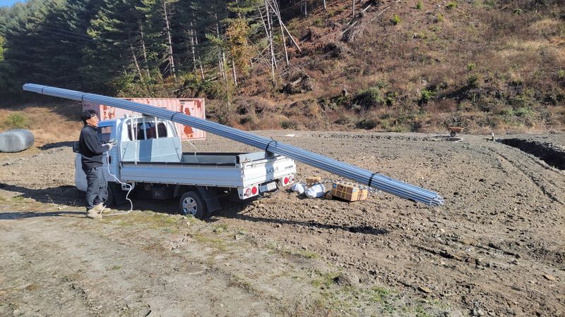 신박하게 하우스 파이프 내리는 방법ᆢ? ㅎㅎ 사진이 없습니다. 그냥 바만 풀고 앞으로 전진? 자연스럽게 흘러 내리더군요. 어제 자재들이고, 오늘 세사람이 뚝딱 뼈대를 세웠습니다. 오후 약간의 가랑비 탓에 일이 조금 늦었다는데ᆢ? ㅎㅎ 베트남 기술자들 진짜 일...
