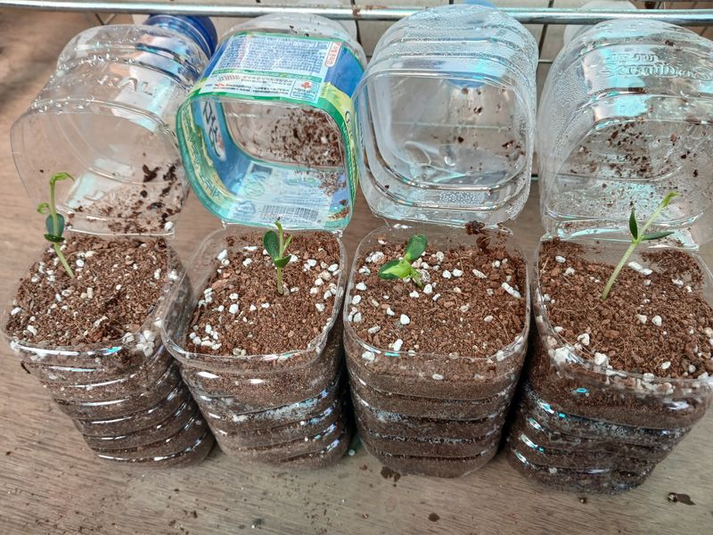 언젠가 보여드렸었죠? 먹고난 사과씨를 실내에서 발아시켰던 모습ᆢ? 이제 꽤 컸습니다. 잎도 세개씩 나고해서, 밖으로 나갈 준비를 합니다. 아직은 추우니 빈 물병들을 모아 밑에 구멍을 뚫어 화분을 만듭니다. 어떤가요? 뚜껑달린 애기사과 화분 ᆢ^^ 아직은 여린 ...