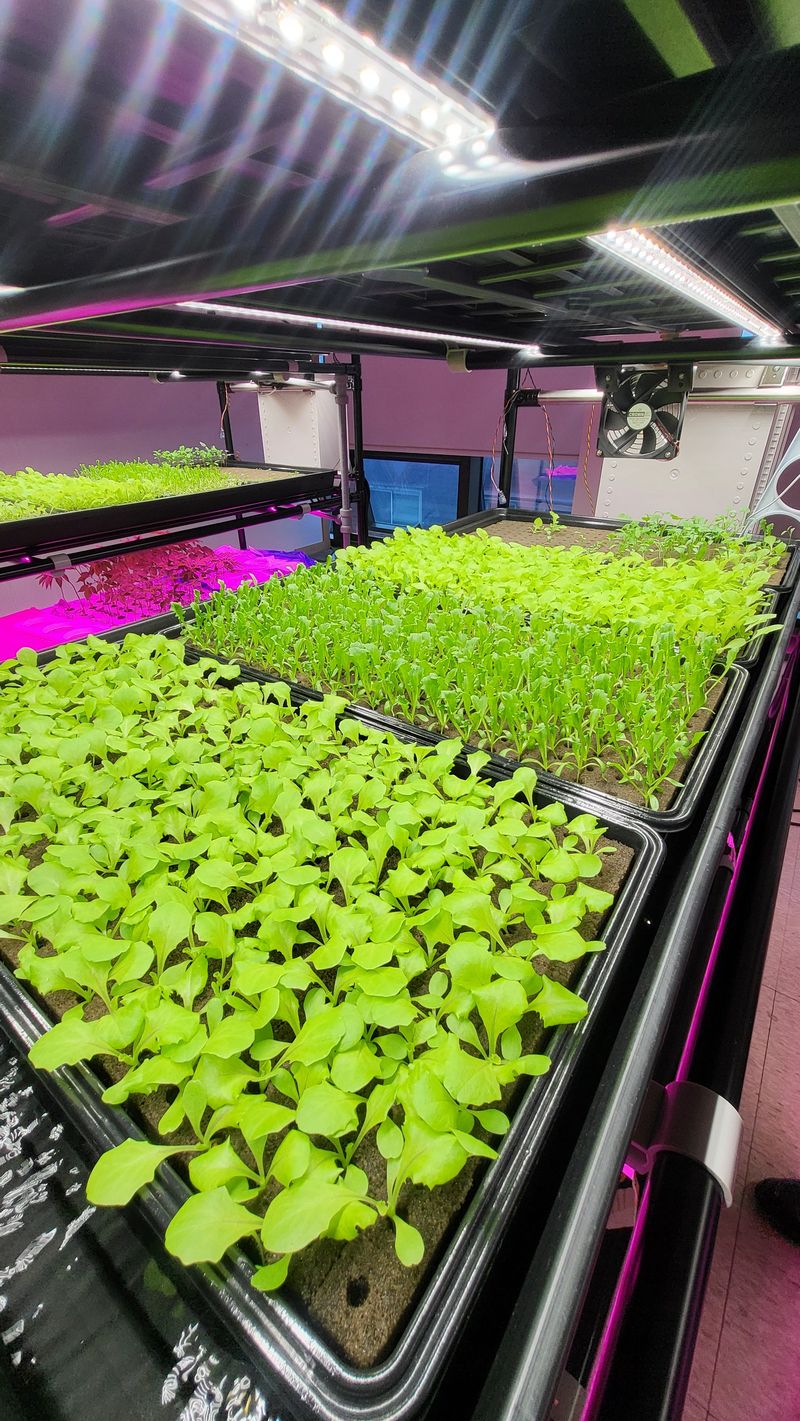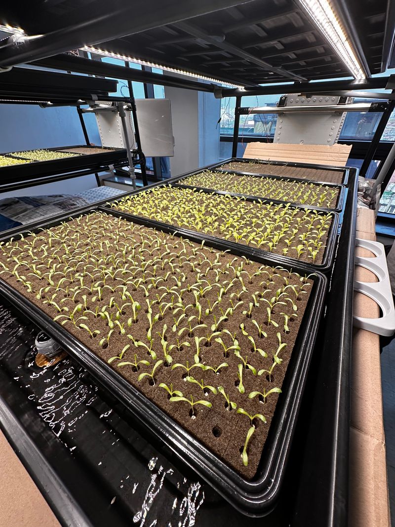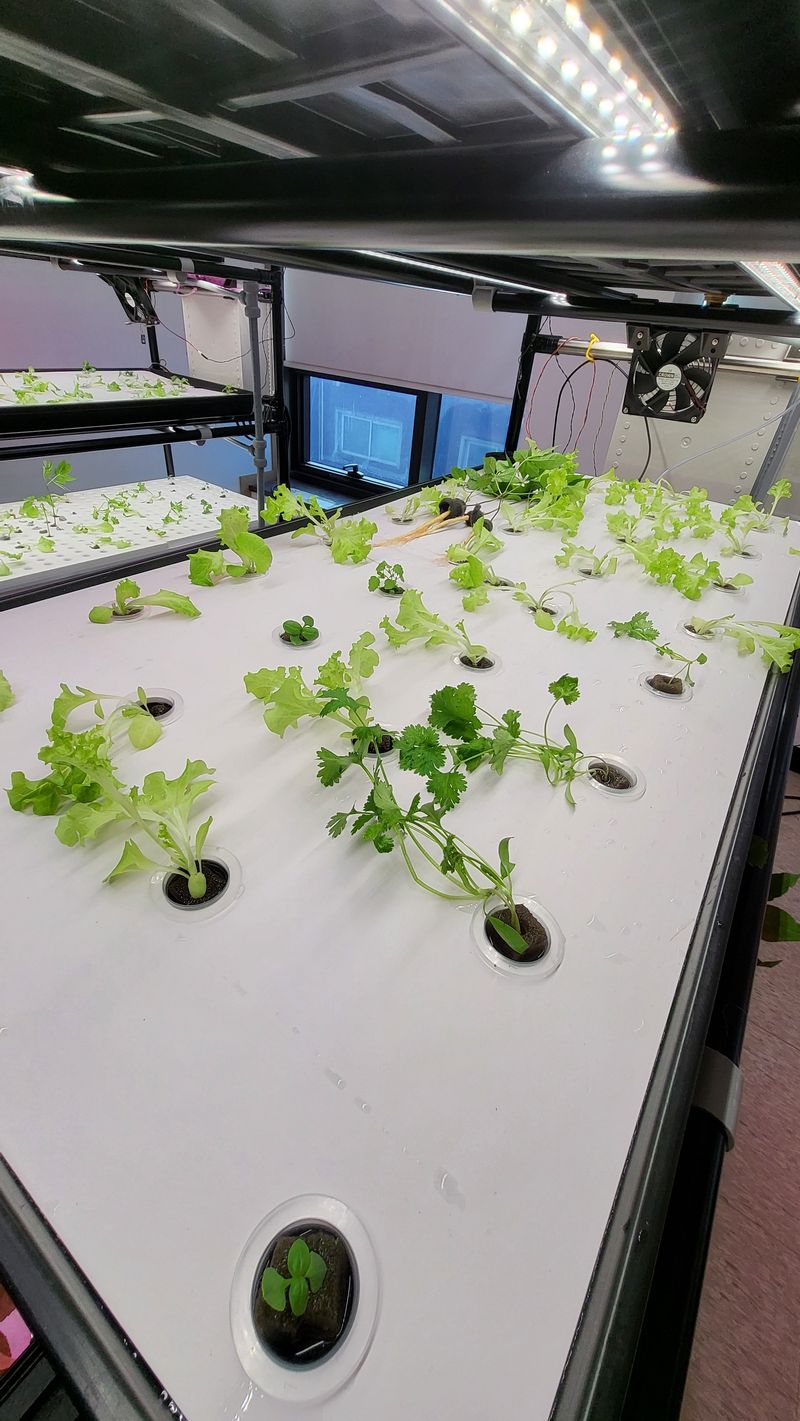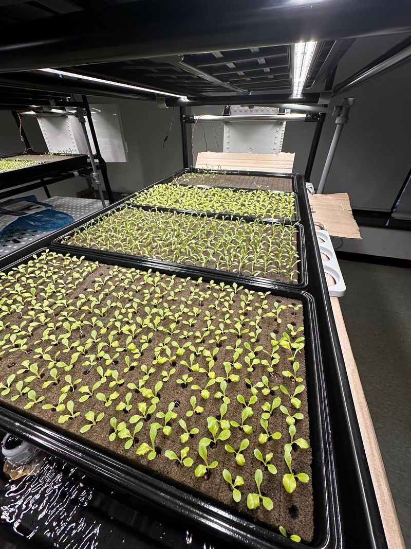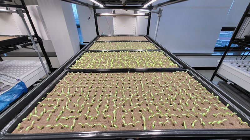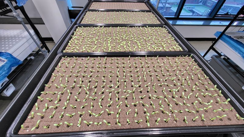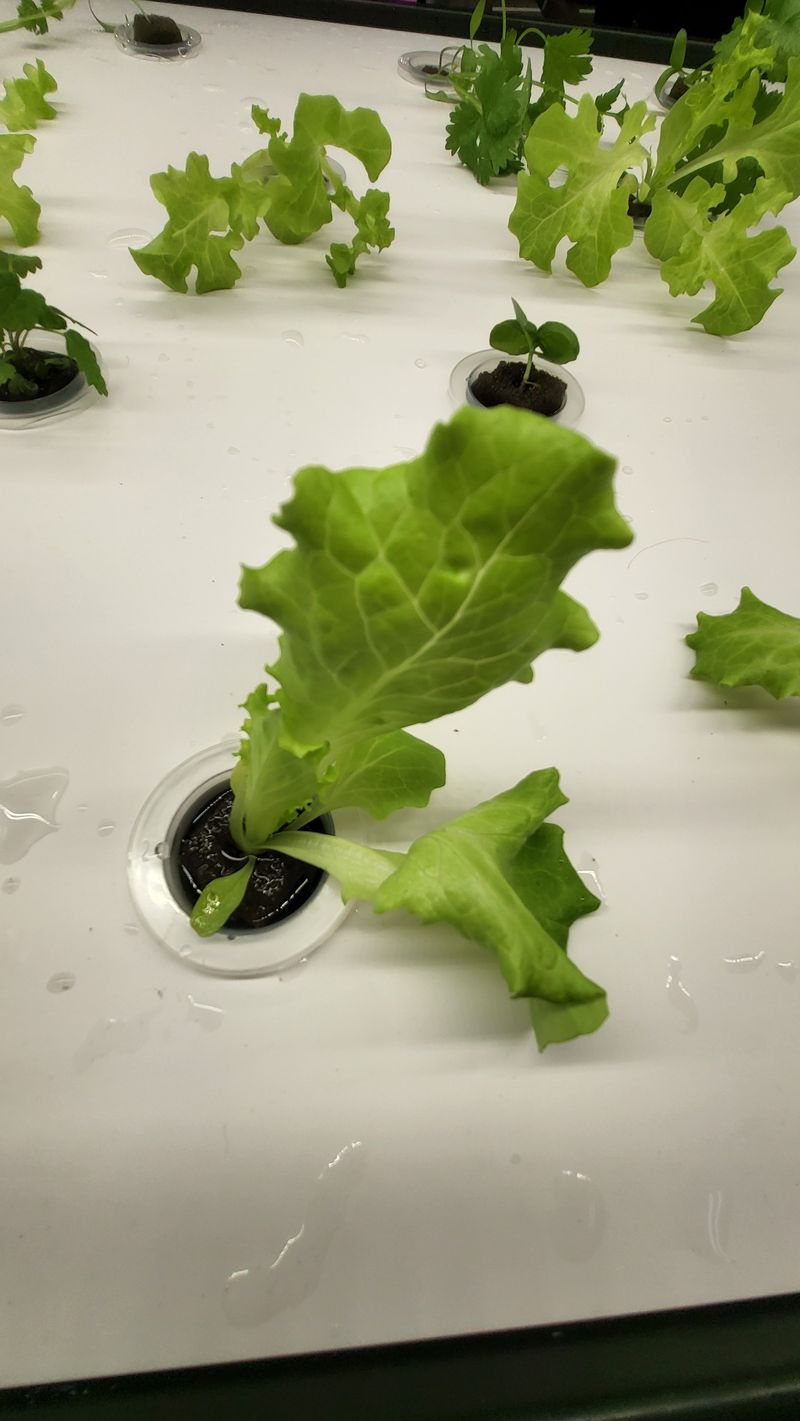 파종상추3종 LED광량 관수 양호상태이고 계속 생장중 특이사항으로 정식한 묘삼 일부에서 잿빛곰팡이병 발생됨 감염된 묘삼은 일부 제거 했음