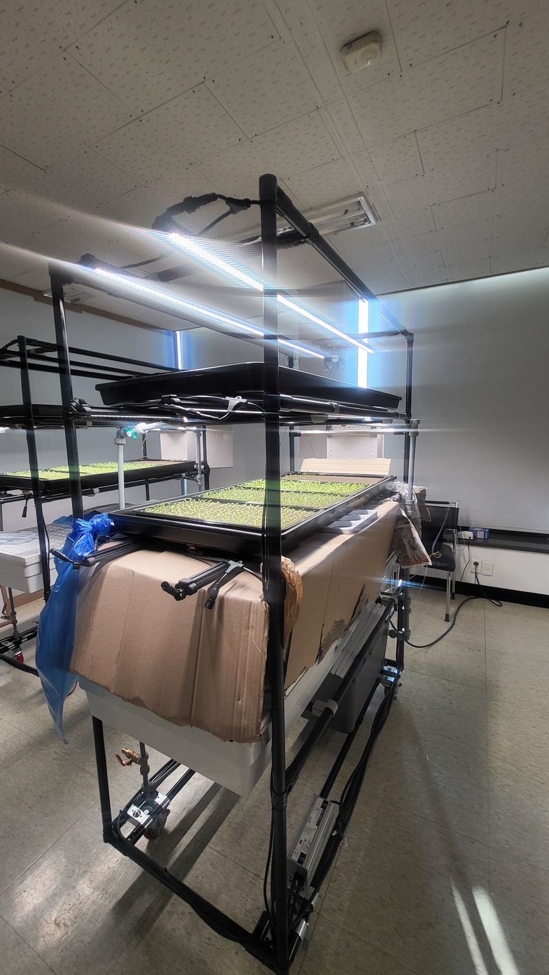 작물 상태 좋음 새싹삼/ 암실로 많들고 상태불량 병증보이는 삼 제거진행 빛을 최소화해서 생장을 진행 수온을 낯추고 용존산소량을 높이기위해서 어항용 에어펌프 양액기부착