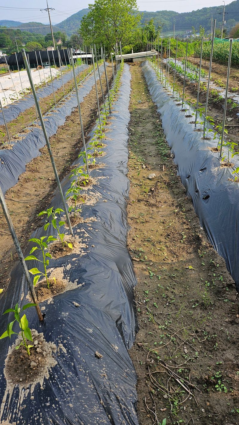 고추 모종 완료 했습니다.전년에탄저병으로 가슴앓이 하여 심지않으려다. 용기내어 다시 심어봅니다.200개 정식했는데 어떤결과가 될진 모르겠으나방제 작업 잘하고 잘 살펴 실패 적게 해봅니다. 마늘은 잘자라고 있는것 같은데 이상합니다. 보신 분들 이상 징후 알려주세요 ... 더보기