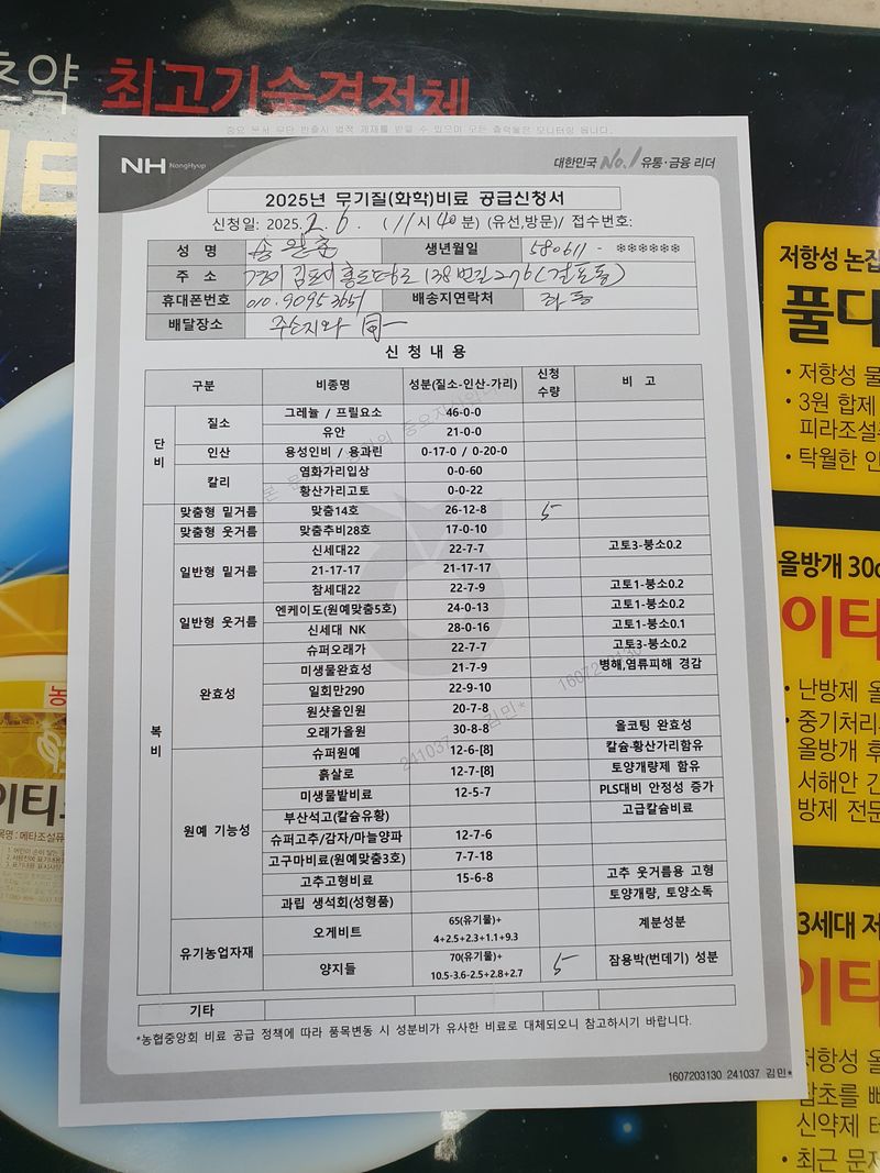 1,퇴비 210포대(70×3) 2,유박 7포대,혼합유기 7포대,복합비료 7포대 김포동사무소 신청완료