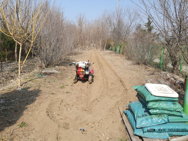 1번 토지 밭갈기 4번 토지 하우스 內 밭갈기 4번 울타리 제거 및 소나무 가지치기 (옆집에서 시설 신축관련) 부추 퇴비시비