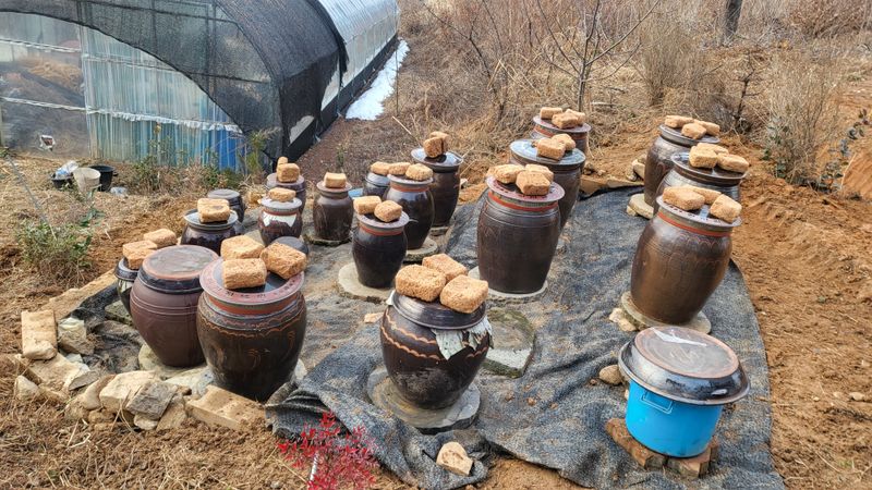 2월 16일 어제 일요일 장 담을준비 하였다. 메주 씻어 널어두고, 항아리 씻어 말려 두었다. 소금 7키로씩 넣고 생수 2×20병 부어 녹여 두었다.