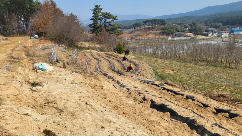 길다란 밭 두둑 만들어 복분자 심었어요. 300평 정도 되는지 비닐 큰통 하나 다 썼네요. 관리 잘 해서 내년엔 대박 나야지요.