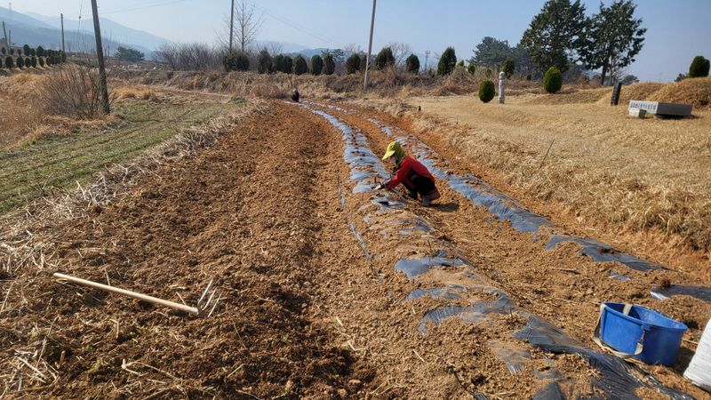 살균제, 붕사 뿌리고, 비닐멀칭 작업 하다.