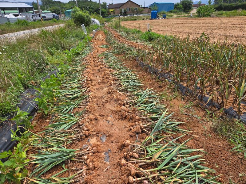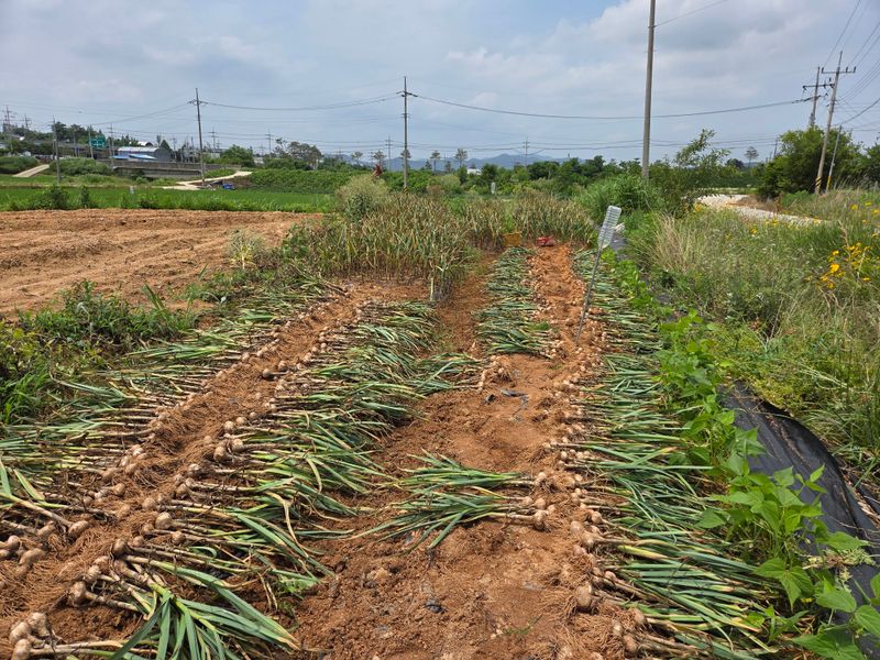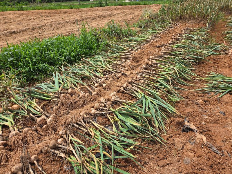 홍산마늘 17일 하루종일 마늘 캤다. 주말 비온다는 예보에 부지런히 한다고 했는데도 조금 남아 다음날 캤다. 19일 흙 털고 25개씩 묶어 하우스로 옮겼다.