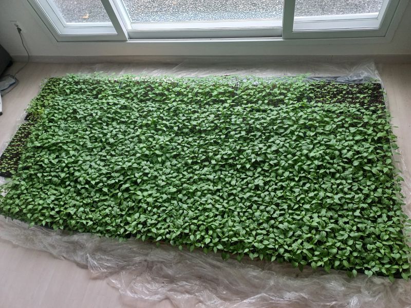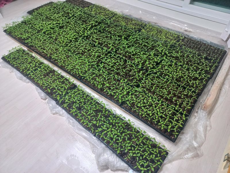 2월 1일 고추 모종트레이에 신호탄 1200주 청양 300주 파종 했는데 이 만큼 컸어요. 비닐하우스가 없어서 집안 거실 창가에 육묘장입니다. 웃자람 연약한 육묘가 될까 걱정되어 물 조절하고 있습니다. 3월 중순되면 미니 터널로 이사할 계획입니다. 옆에 보이는건 양배...