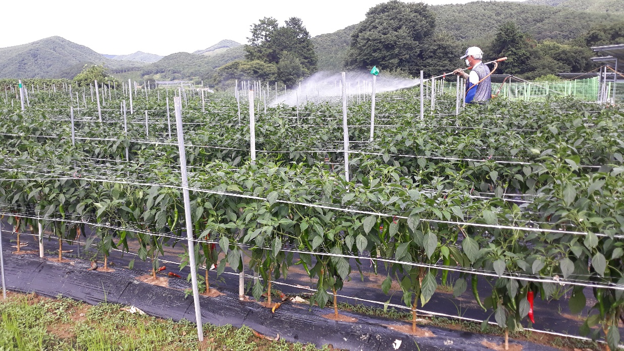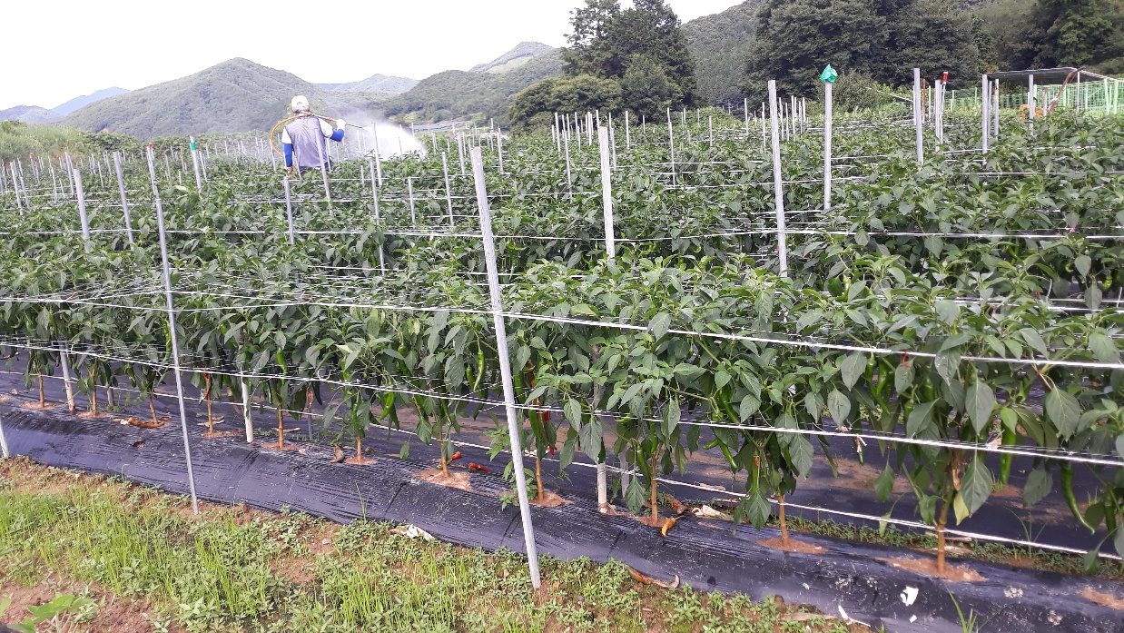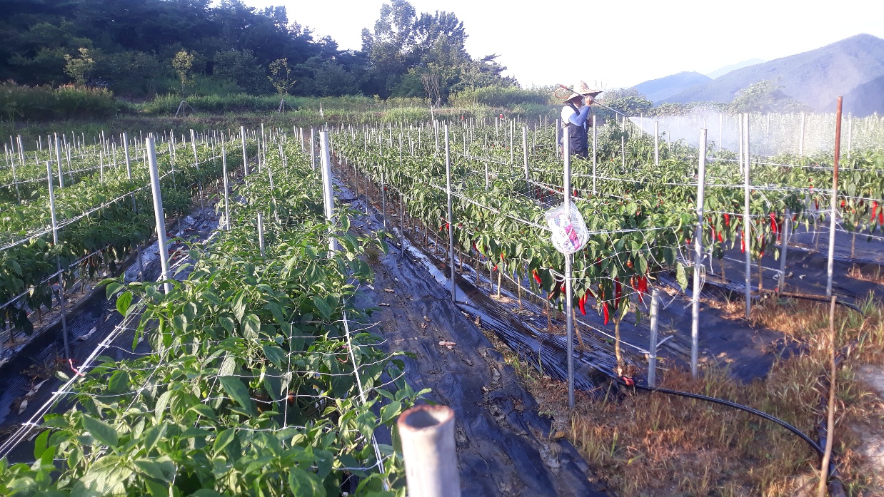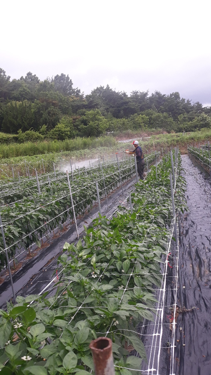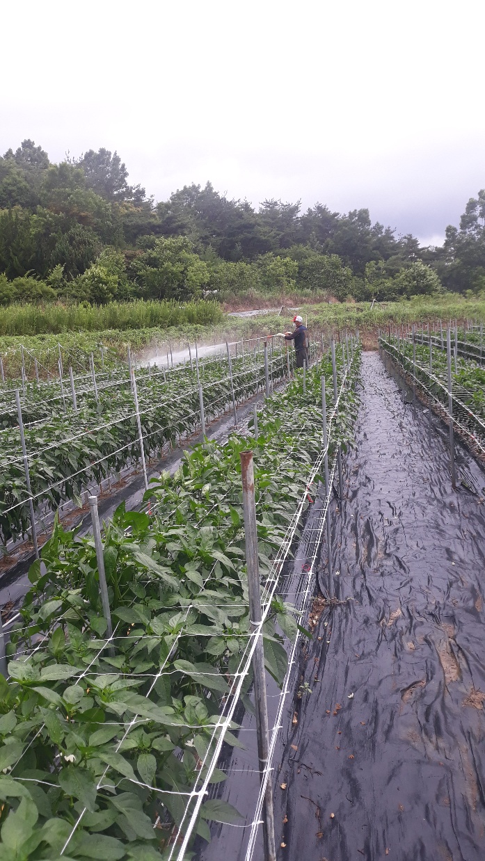 비가 잠시 소강상태 라 고추밭 방제 하였습니다