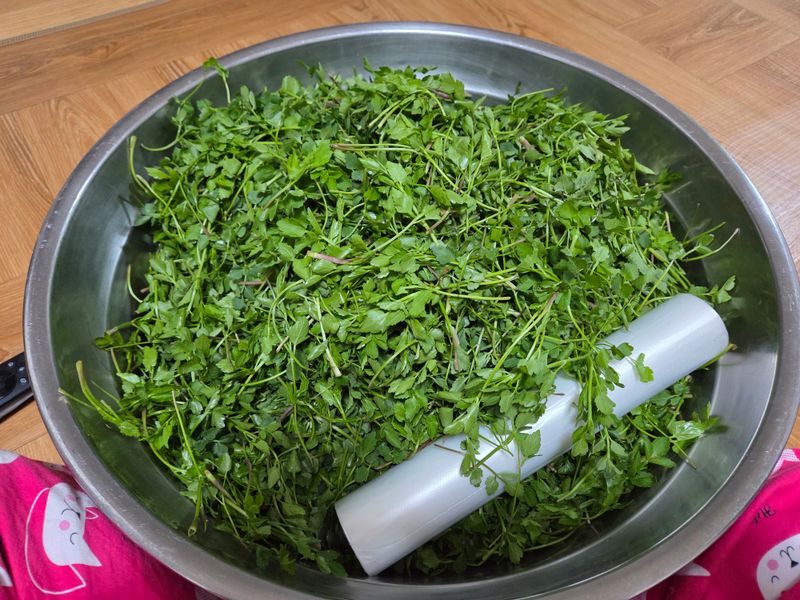 잘자란 미나리부터 수확후 비료주고 풀뽑아주고 갈구리로 긁어줌