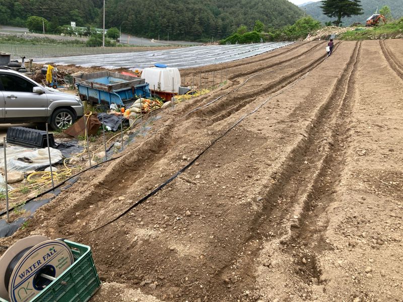 고추 북주기(2/3) 완료 고추 토양제초제 살포 (2/3) 완료 고추모종 72구(20판) 잔여분 정식(1/2) - 추가로 경운작업, 두둑, 비닐피복 실시