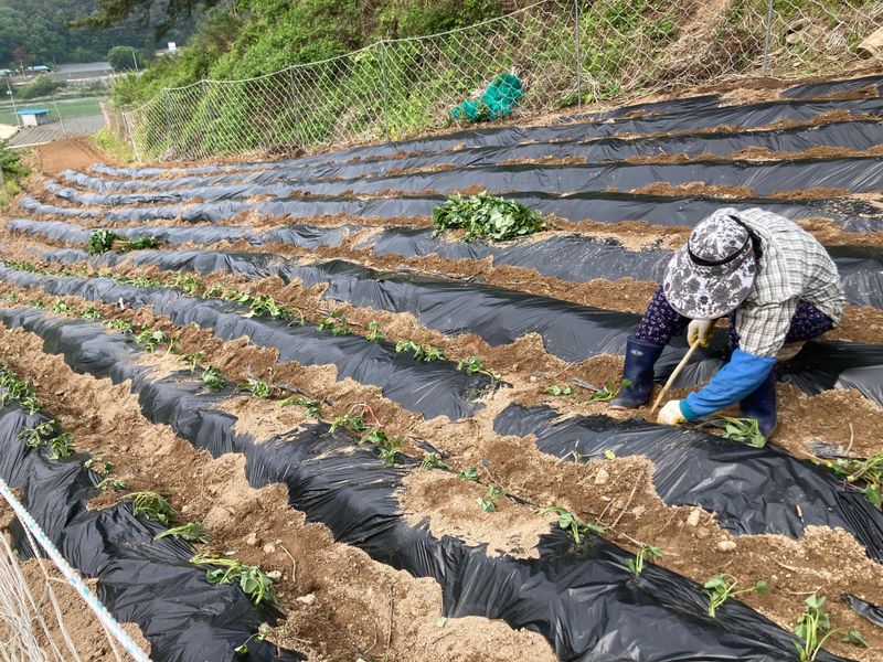고구마 모종 식재 예정지 비닐피복 고구마 모종 정식 수박 두둑 고르기(1/3)