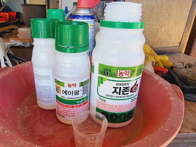 순치기 D동 1~4(반) 3,4마디 침 D동 응애벌래, 진딧물 확인되어 해충약 방제 (쎄티스,지존,에이팜 한말에 10g)