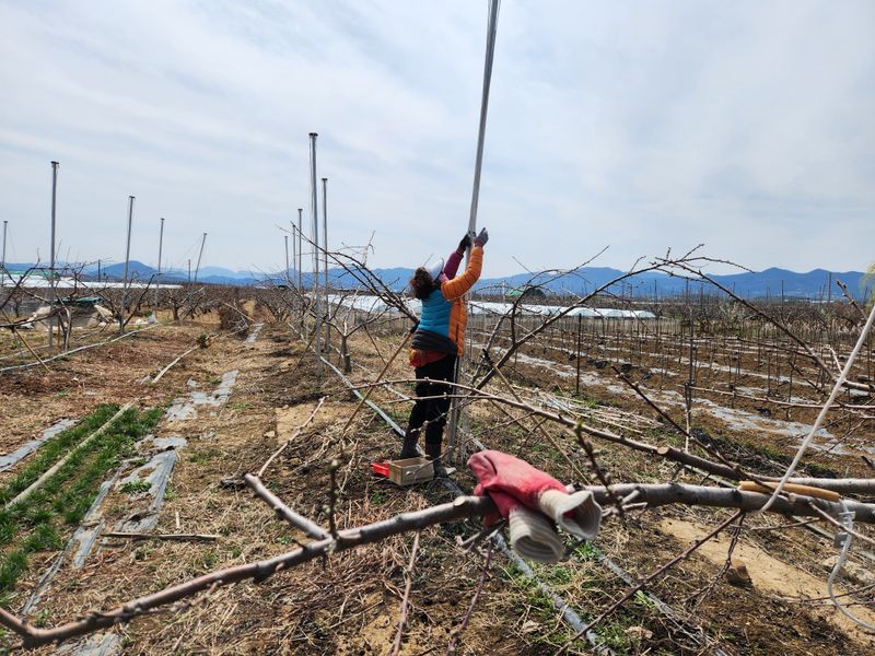 오늘은 가는 길에 농협경제부에 들러 비료값 계산을 하고 밭에서 복숭아 우산형 가지 매기를 했다. 옆지기는 줄을 풀어 잘라둔 호스와 걸고리를 끼워놓으면 따라가며 가지에 걸고 적당히 팽팽하게 당겨 고리로 고정하는 작업을 했다. 어제 병원에서 주사를 맞고 물리치료까지 받...