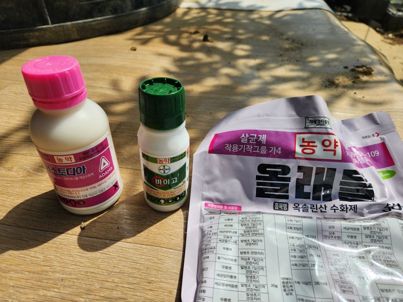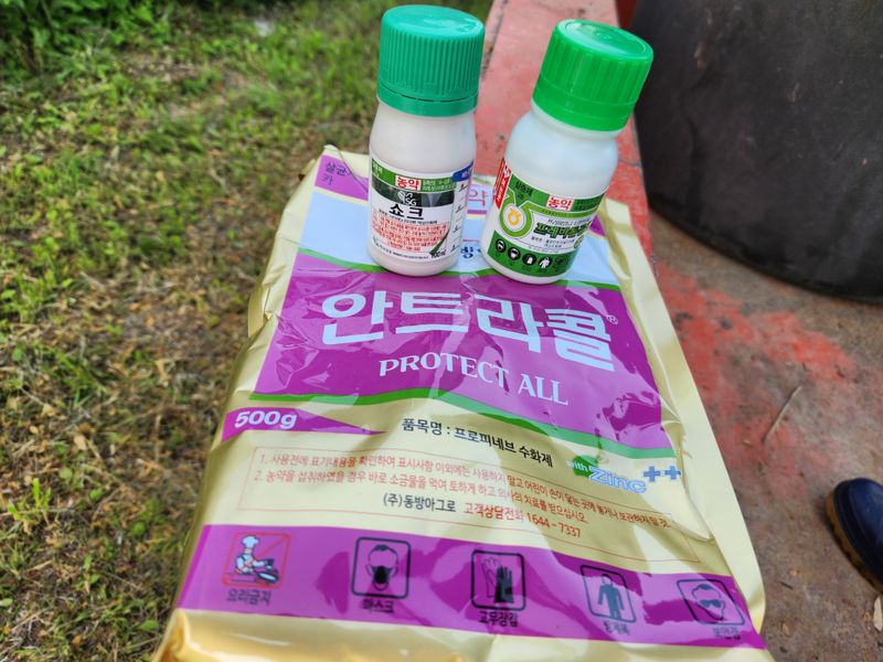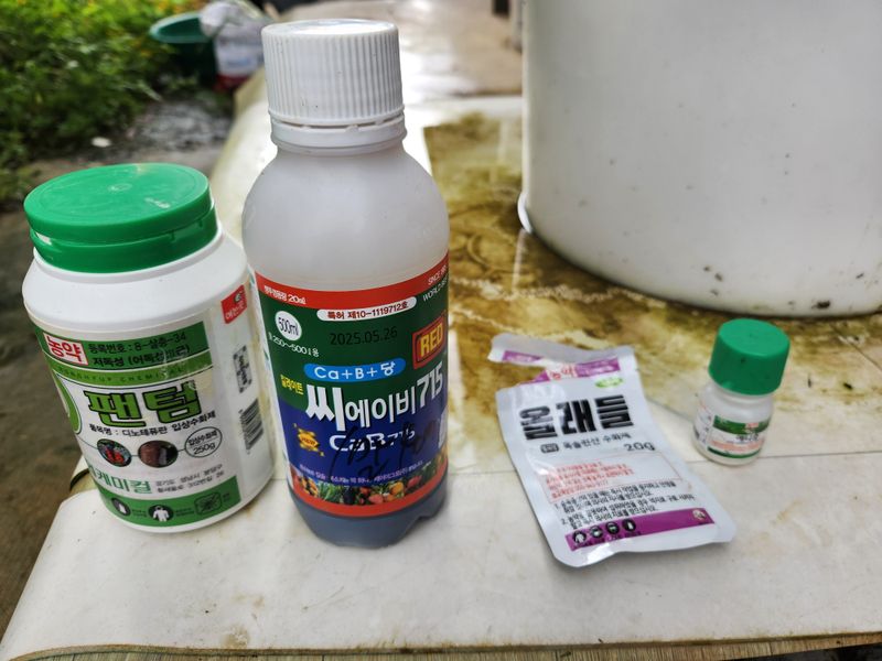 수확 후 약을 언제 칠까 망설이다가 끝이 마르는 증세가 있고 새벽 기온도 24도로 떨어졌기에 이때다 싶어 05:30에 일어나 밭으로 가 오랜만에 노즐을 잡았다. 며칠 전 입구 쪽 14~5그루는 하계 전정을 하였지만 안쪽에는 도장지와 신초가 들어차 골고루 치려니 시간...