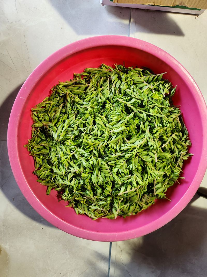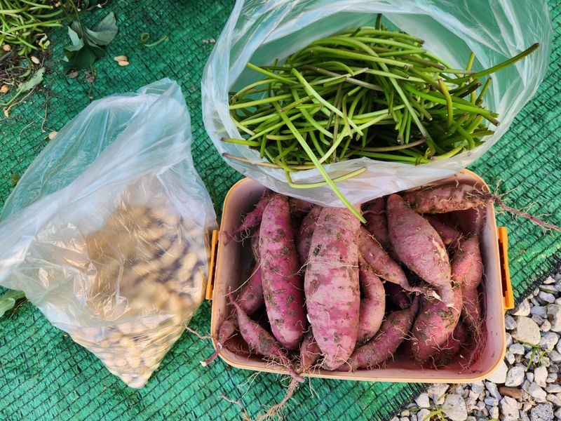 어제 수확하면서 대극천을 살펴보니 벌써 고운색을 입고 있기에 오늘은 새벽 네시에 나가 타이벡을 깔았다. 서서 수확하는 것도 허리가 아프지만 쪼그리고 앉거나 기어 다니며 일하는 건 더욱 힘이 든다. 가끔 선선한 바람이 불어 주어 달아 오른 몸이 식긴 해도 숨은 턱...