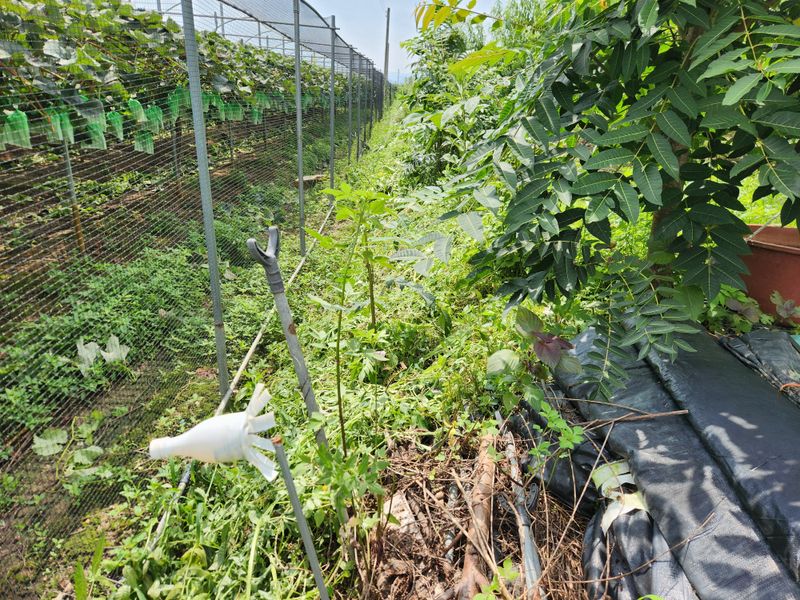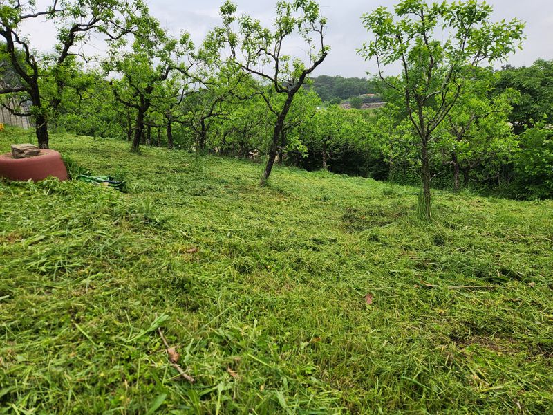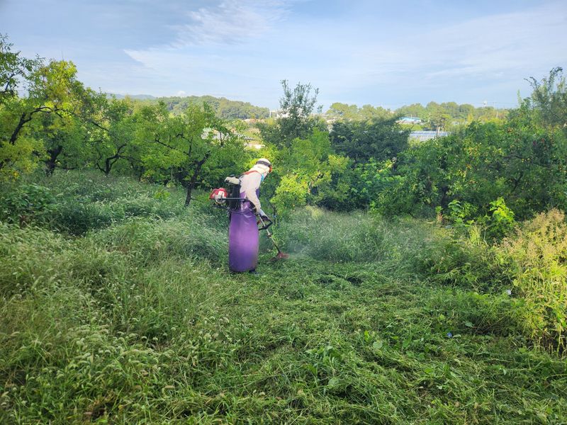 오늘도 계획에 따라 06:00에 집을 나서 촌집에서 예초기를 챙겨 친구의 도움을 받으며 대추밭 풀베기 작업을 했다. 엄두가 나지 않았었는데 '사람 손이 무섭다'는 말이 있듯 한사람이 더 있으니 시간이 단축된다. 바랭이, 개밀, 메귀리, 털밥새귀리, 망촛대, 띠와...