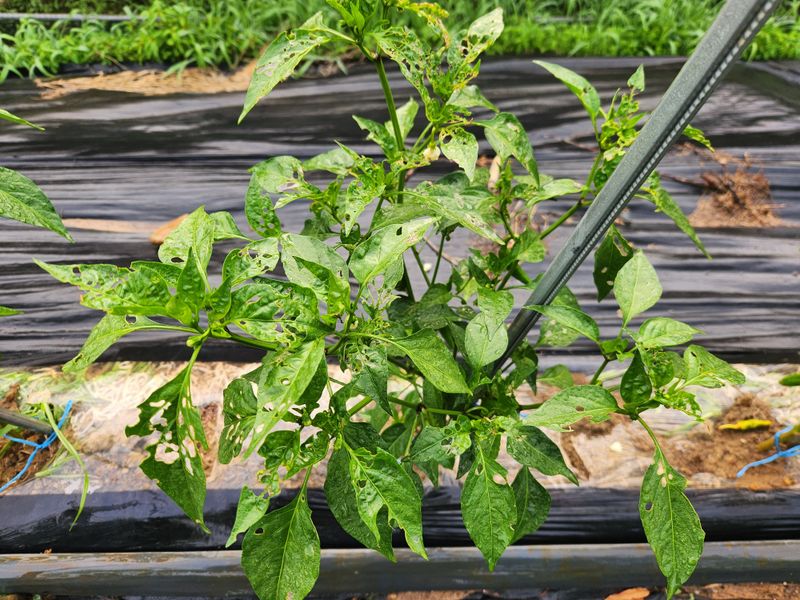 오늘도 새벽부터 밭으로 나가 집사람이 대극천 수확을 하는 동안 고추에 처음으로 칼슘과 사과식초를 섞은 약을 쳤다. 내내 건강하게 자라고 있던 110포기 중 딱 하나가 벌레 먹은 듯 이파리에 병징이 있어 더 번지기 전에 서둘러 방제한 것이다. 열두 시부터 비가 온다는...