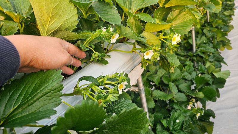 딸기 정식 5일차 날씨 맑고 햇살쨍쨍 아침9시 관주시작 오후5시 마지막 관주 ec0,7 ph6.2 각각 52미리씩 총9번 아침일찍 7시 환기시키고 하우스내부온도가 30도가 되어도 차광망을 하지 않았다. 뜨거운 햇빛이 아니었다. 오후에 배기휀을 달고 유공관 연결을 완...