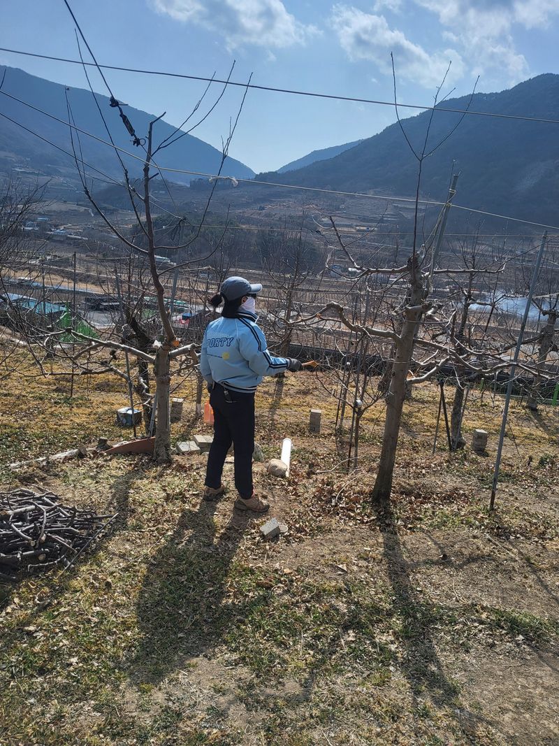 사과비료주기완료(그루당3주먹)매실나무3개4주먹씩/조피작업 하루내내(묘지앞,옆 완료및 제일위 사과밭 거의완료)