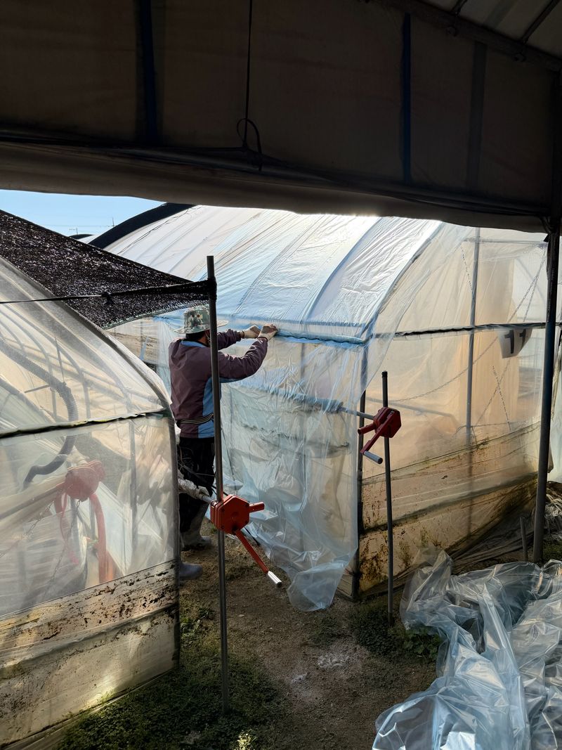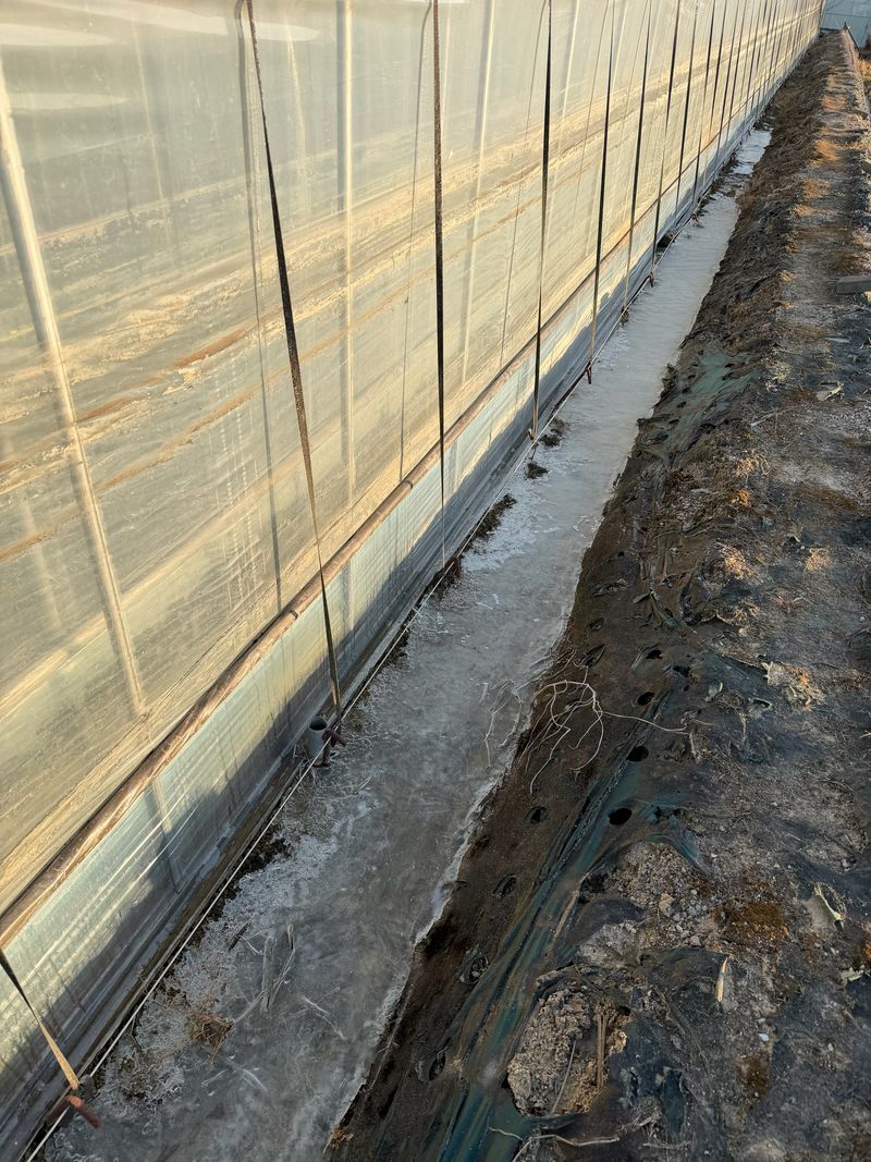 스토크 및 청상추 작업 첫 한파 낮 기온 -3도 하우스 골창 사이 얼음 생기기 시작