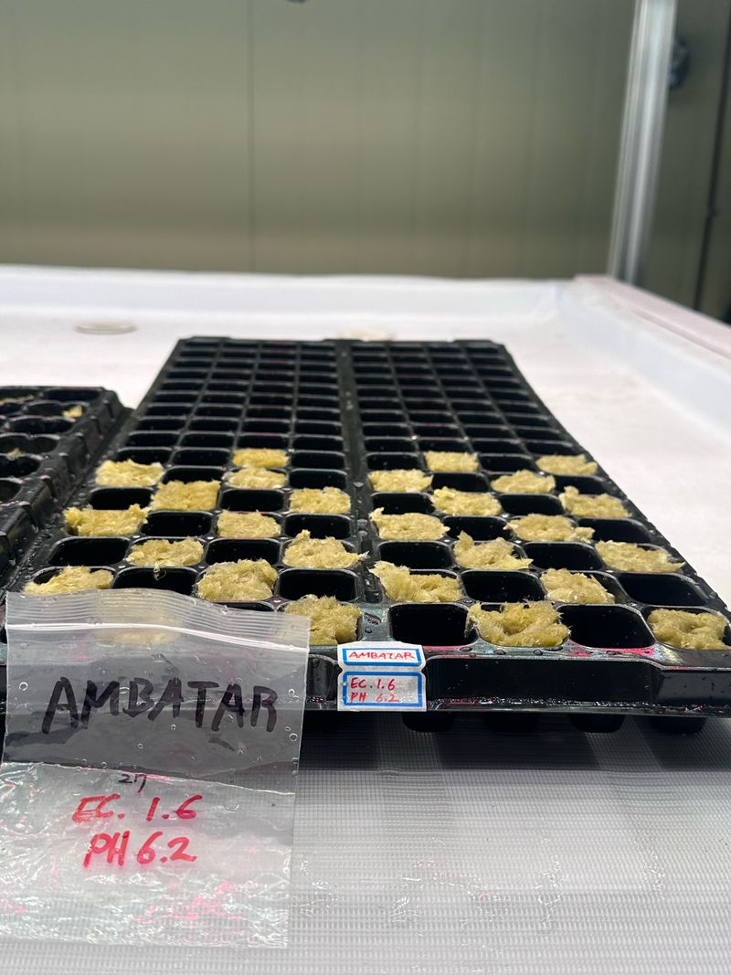 그로단 발아배지를 사용하여, 배지를 EC 2.0 pH: 6.2에 포습시켜서, 발아실에서 발아시켰습니다. F1종자 멜론이기 때문에 암-광발아에 영향이 없습니다. 발아실온도는 주간 23도 야간 16도입니다. 수직육묘장에서 재배하기 때문에 발아 후 빛의 세기는 PPF...