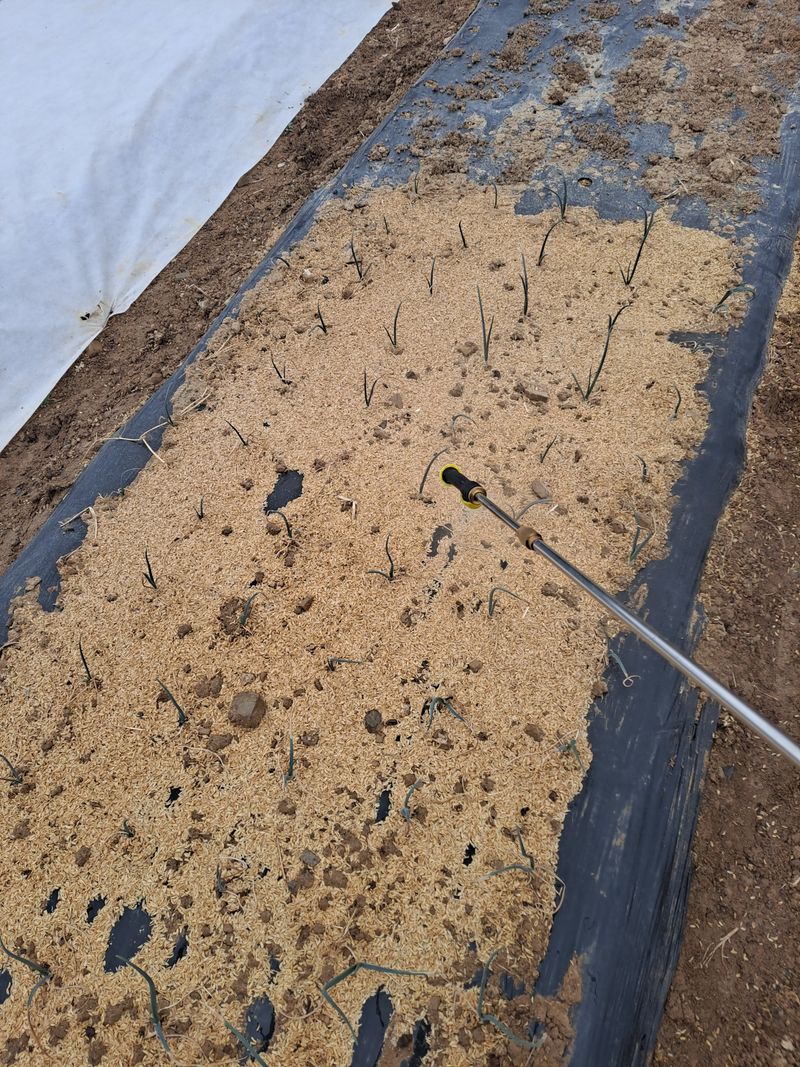 의성마늘 부직포 제거 및 새순 뽑아올리고 비닐위로 흙덮음 마늘밭 뿌리발근제. 아즈모엠지. 규산황 혼합 살포 표고버섯 접종