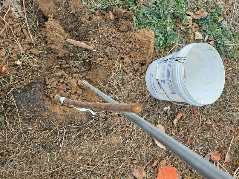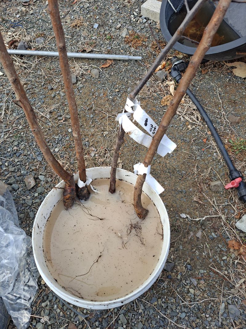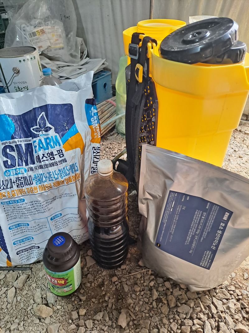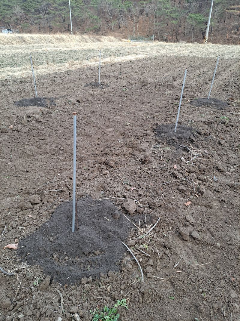 감홍 1그루, 살구 초하1그루, 살구 하코트2그루 식재 물 3말에 뿌리발근제120ml, 아즈모엠지60ml를 혼합하여 30분간 침전 후 식재, 식재시에도 혼합물 사용