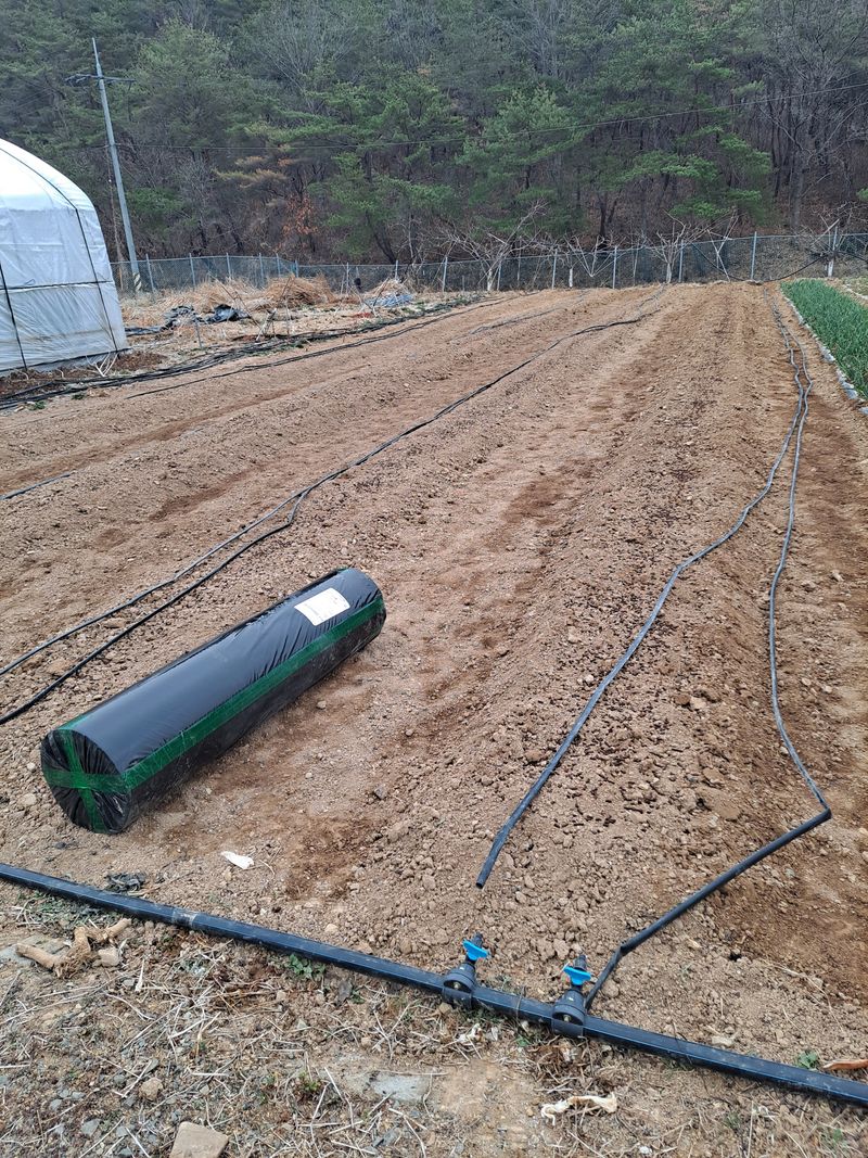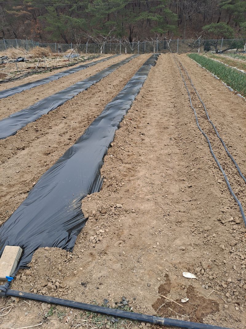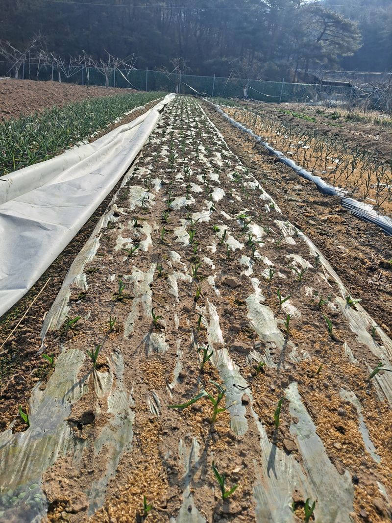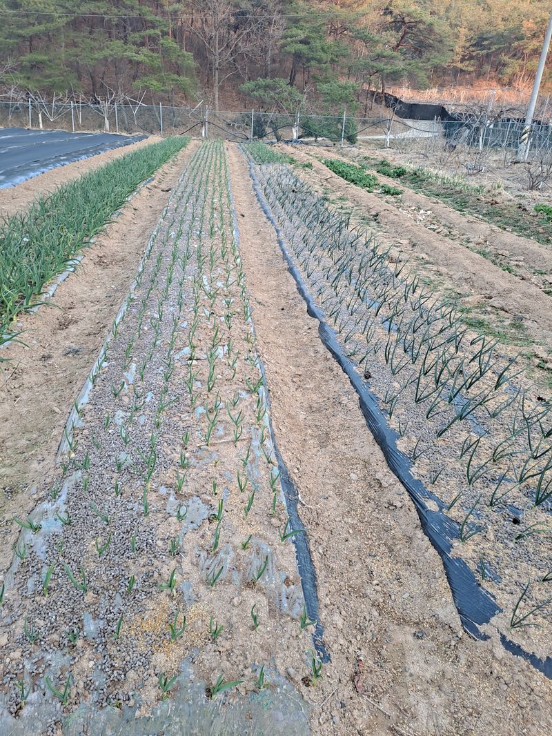 마늘밭 흙으로 덮고 풀 제거 물 1말에 NPK수용성비료 40ml. 아미노산 80ml희석하여 살포 의성마늘과 양파에 유박 4포 뿌림