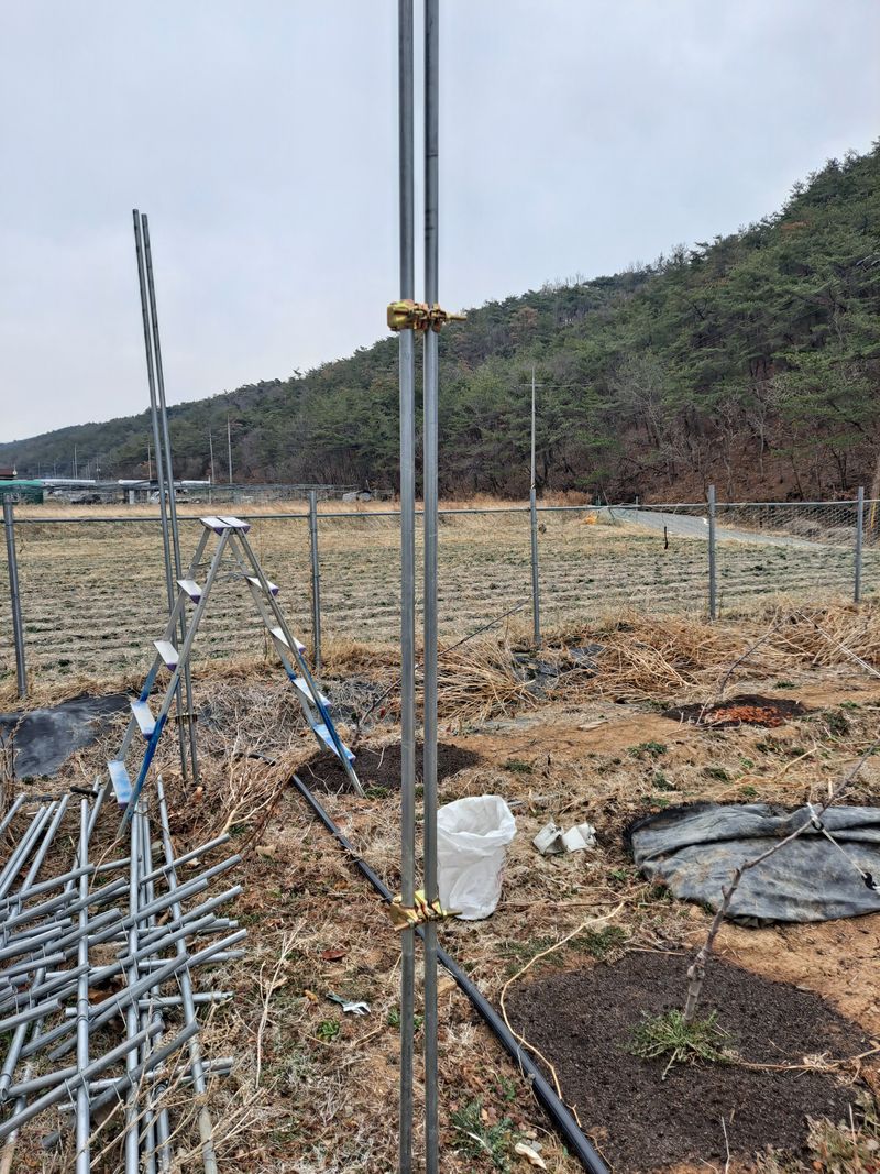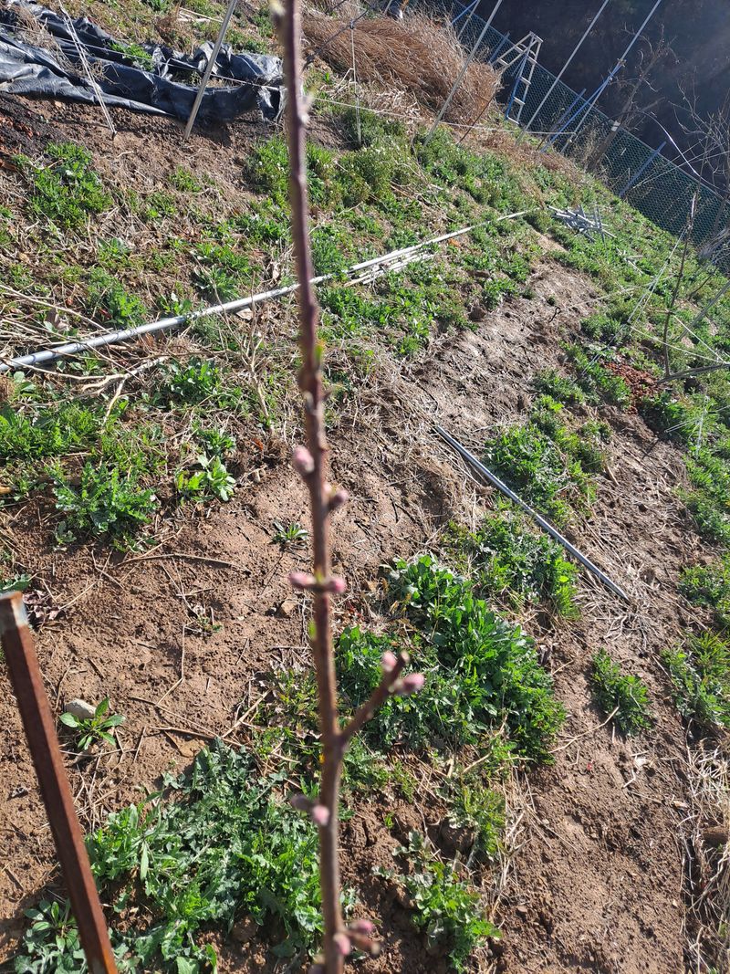 복숭아 꽃눈 적과 마늘과 양파, 아로니아 방충작업 지하수 관수 필터 교체 작업 울타리 바람막이 설치