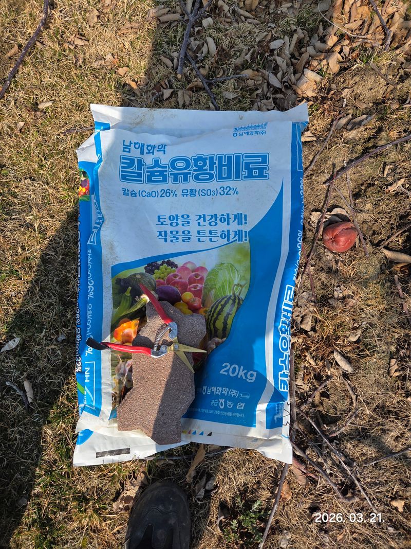 나무 뽑은 자리정리 황산칼슘 시비 12포 전정목 정리 옆과원의 주인분이 친절하게 해주신다 박카스 몇번 대접하였더니 전정목 나르라고 손수레를 실어다 주신다 너무 감동이다 자기네는 SS기로 농약을 살포하니 약줄이 필요없으시다며 필요한 만큼 가져다 쓰시란다 고마운 노부...